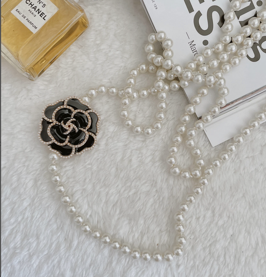 Double Layered Pearl Chain Necklace, Camellia Flower Pearl Long Necklace