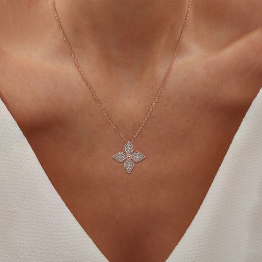 925 Sterling Silver Four-Leaf Clover Necklace, Pave Four Petal Necklace