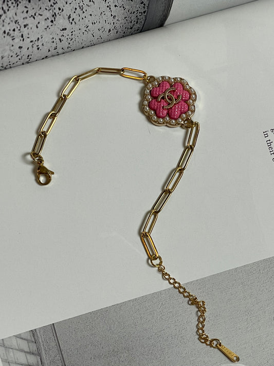 Repurposed Authentic Designer Charm Gold Plated Bracelet, Pink Clover